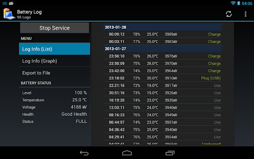 Battery Log is an application that logs the information of the battery.